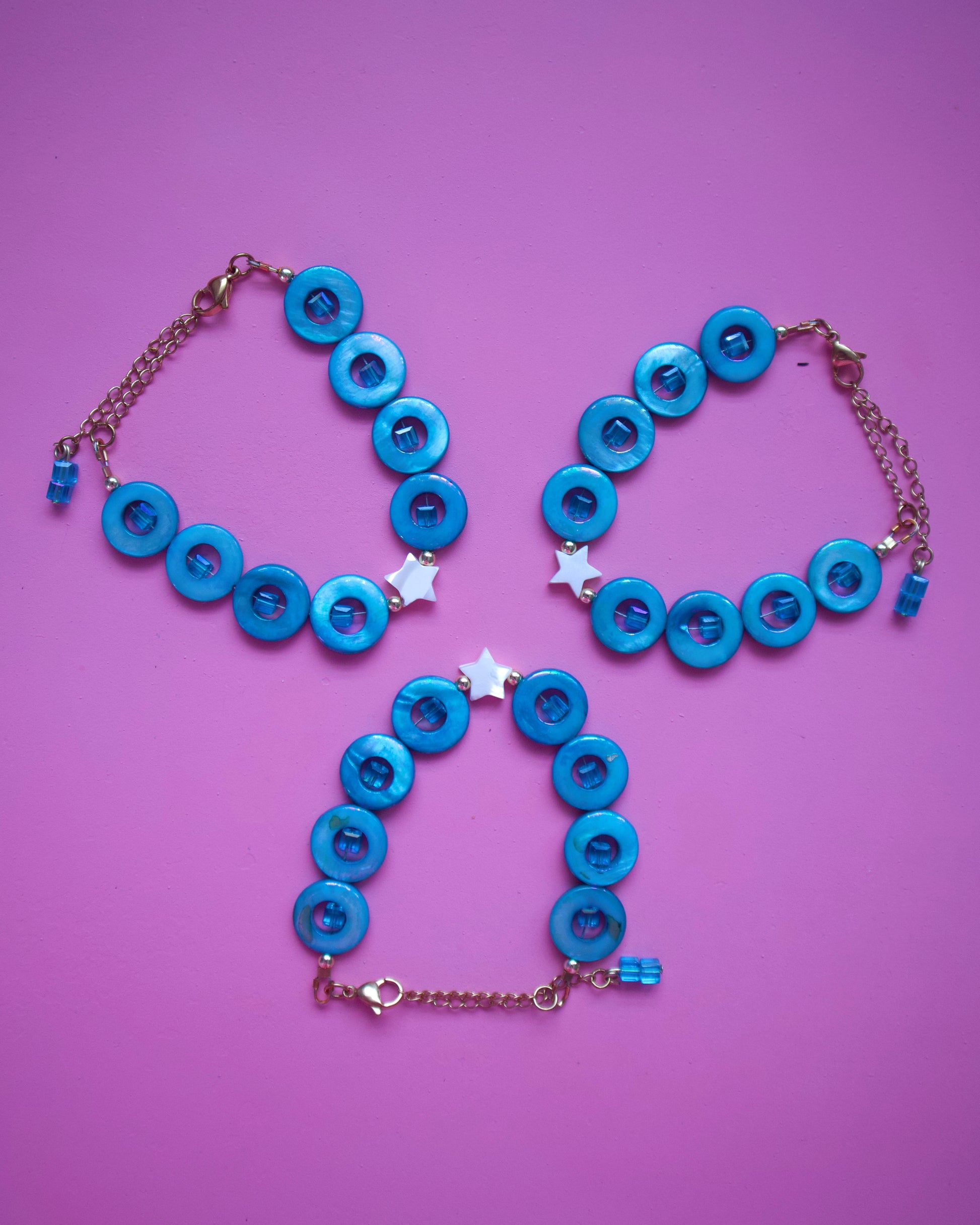 Pulsera de beads en nácar en azul con estrella en nácar. Medida de 5.5” y 2” de extensión.