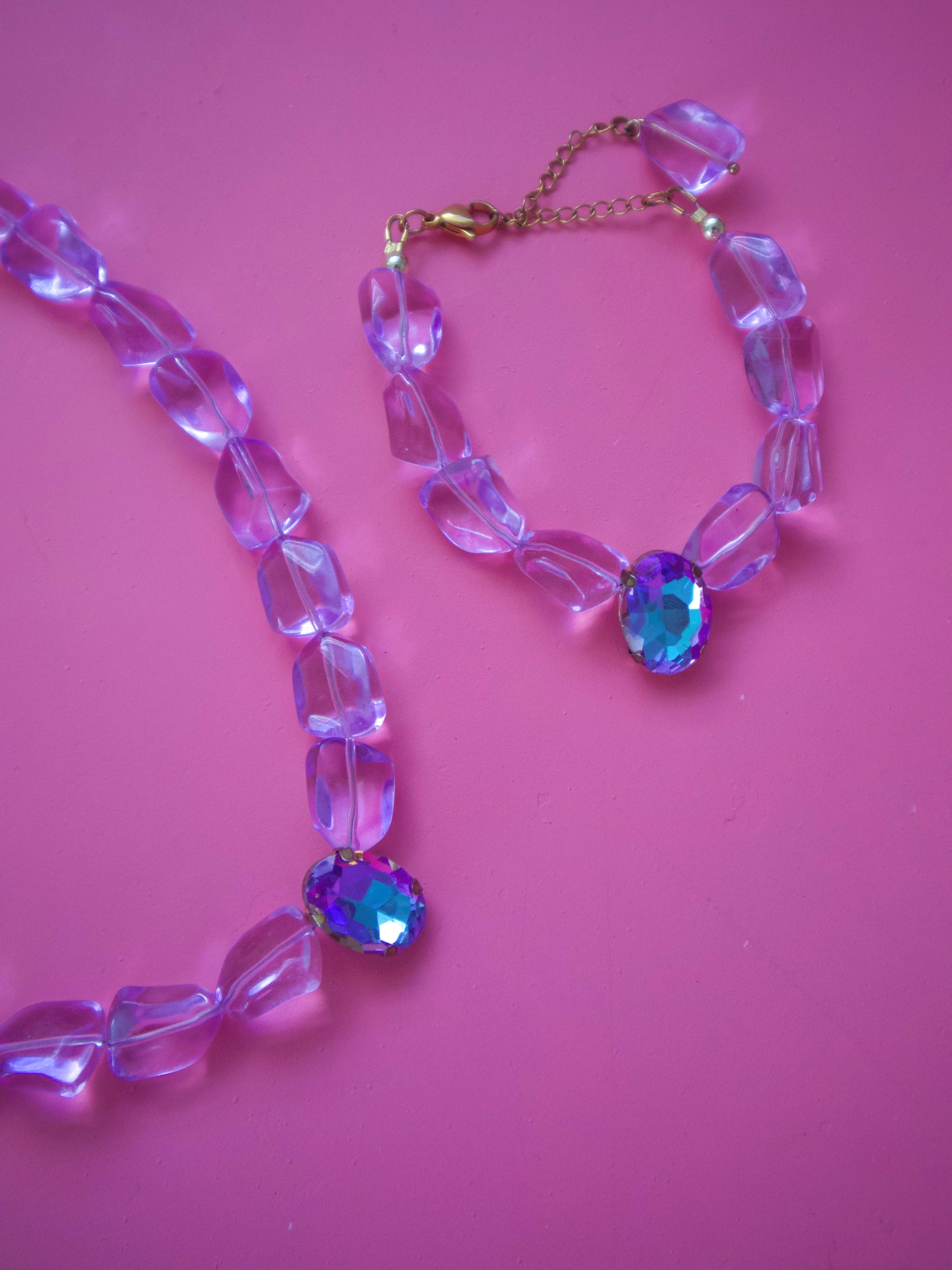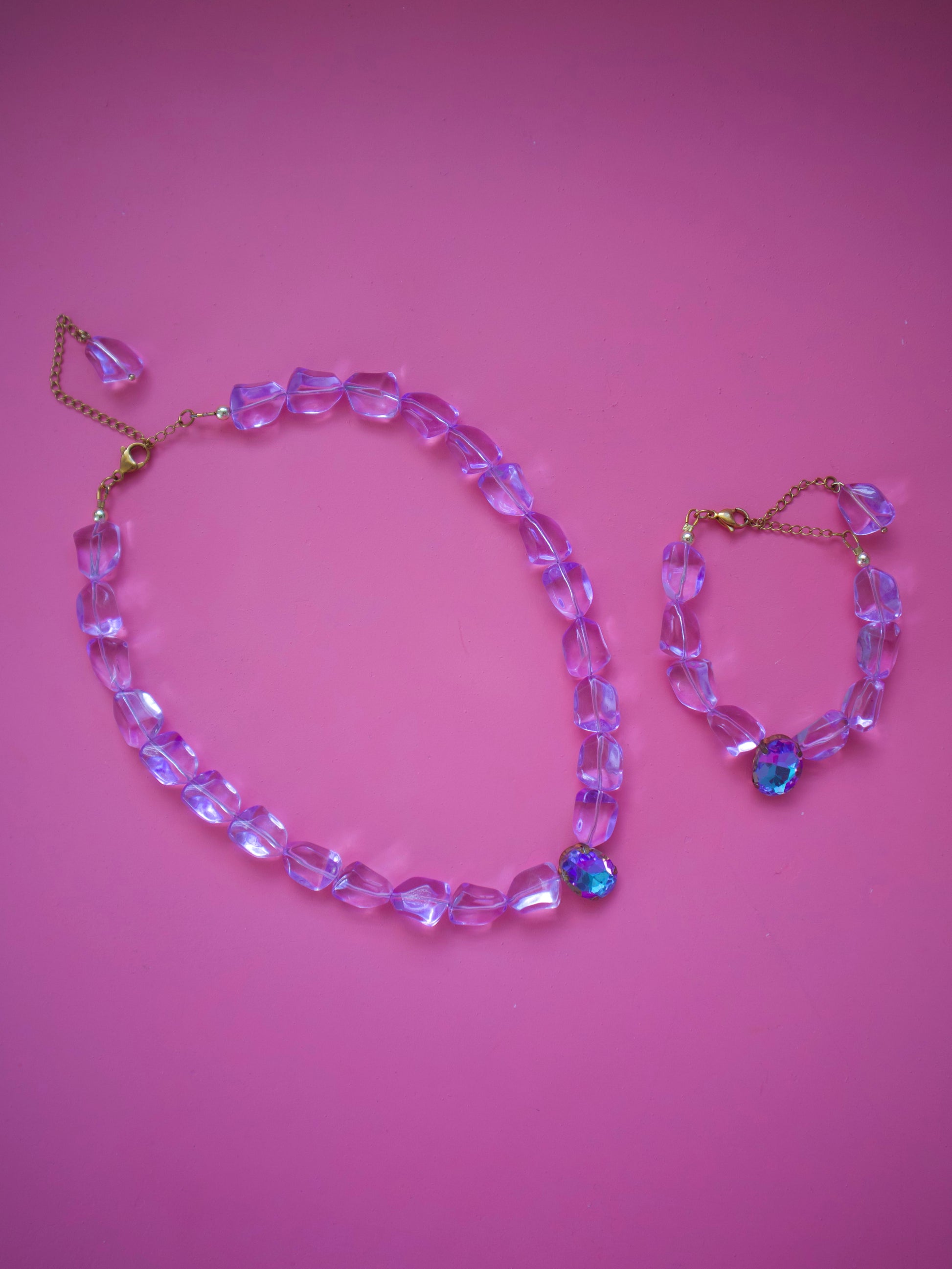 Collar y pulsera de beads de color. Con charm de brillo. Medida de 16.5” con 3” de extensión.