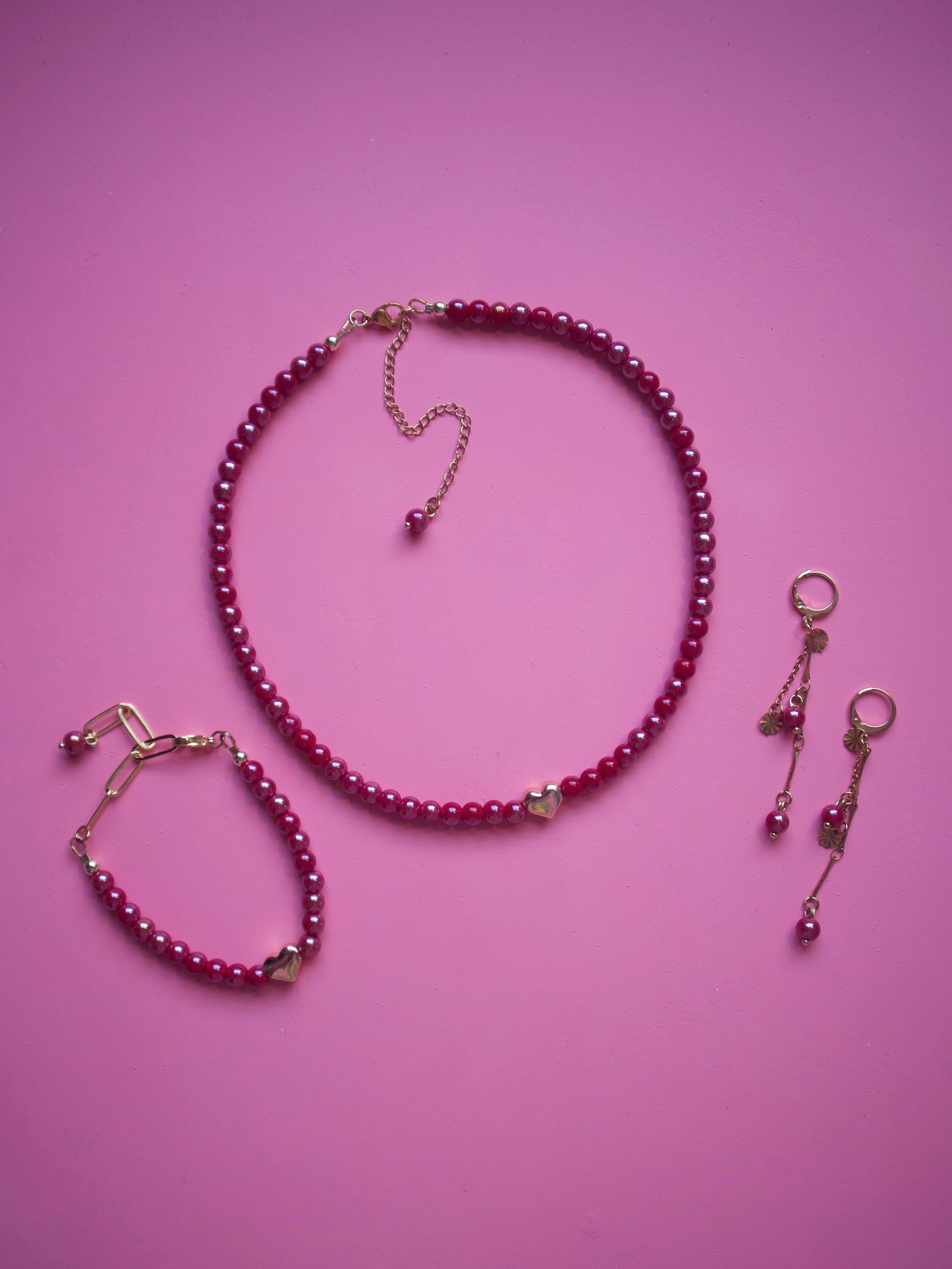 Set de collar, pulsera y pantallas. Con charm de corazón bañado en oro. Pantallas con Hoop en stainless steel. Medida de collar 15” con 3” de extensión. Medida de pulsera de 5.5” con 2.5” de extensión.