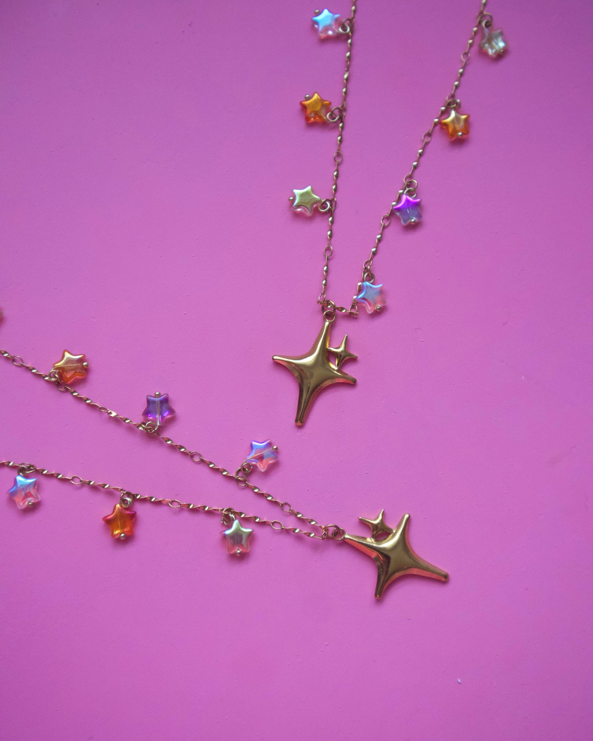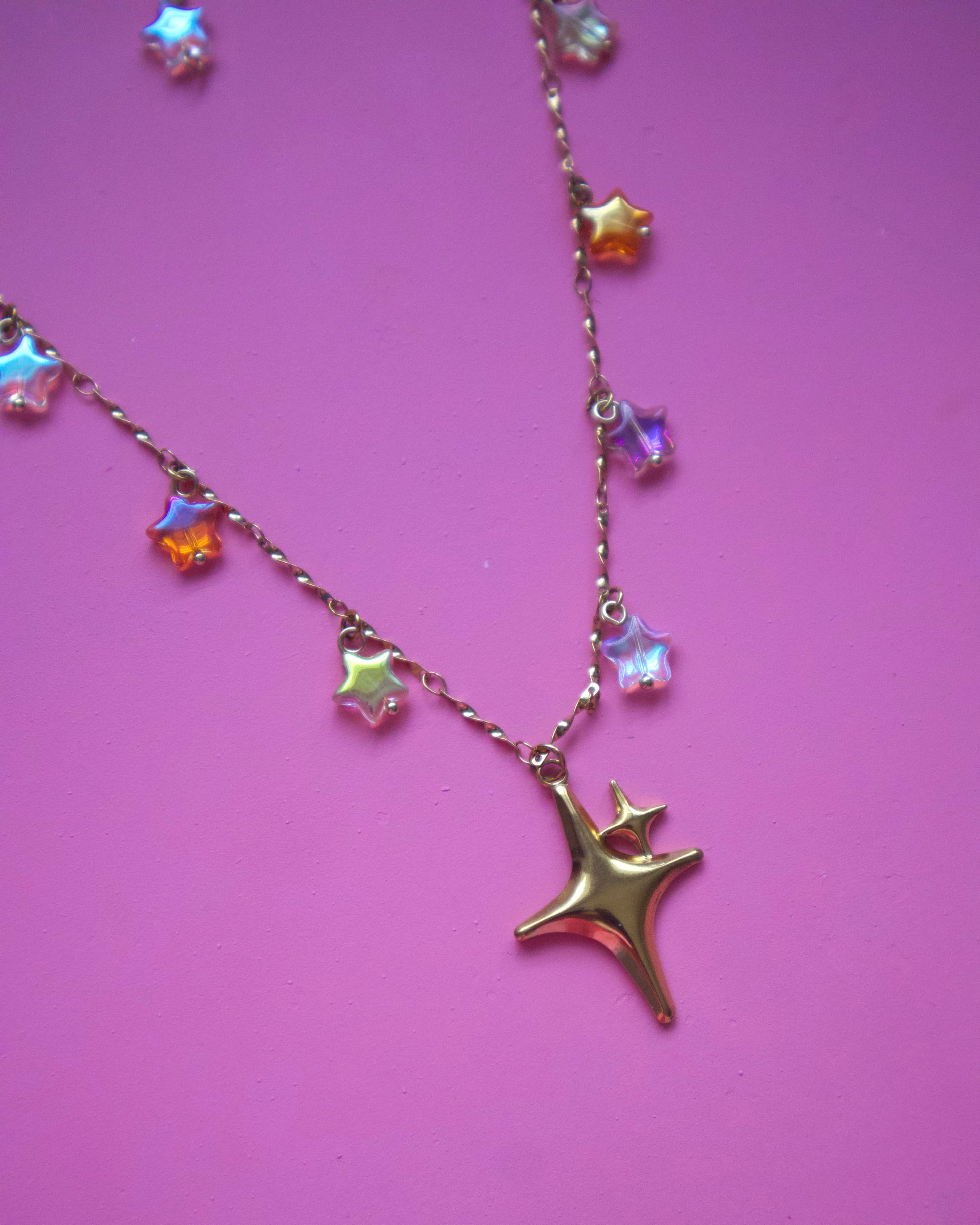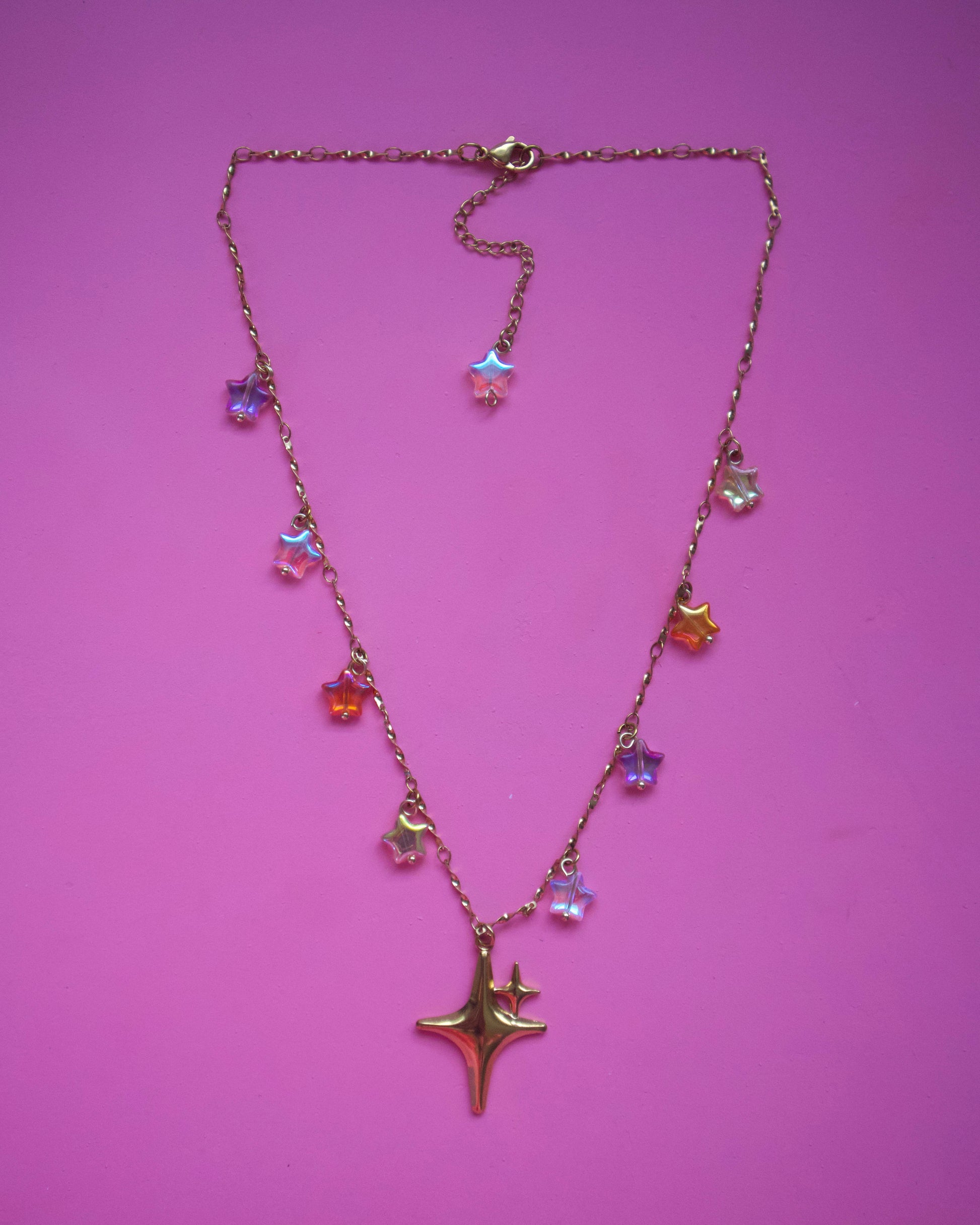 Cadena y charm en stainless steel con estrellas colgantes. Medida de 17” com 2” de extensión.