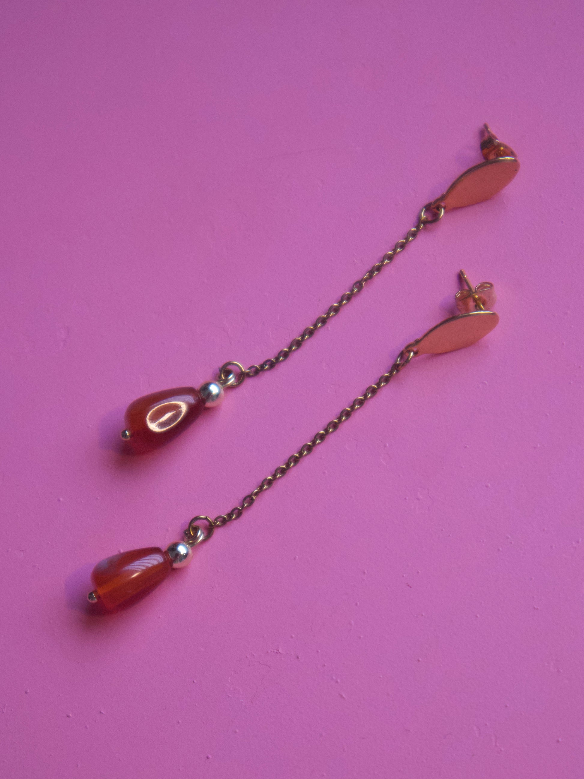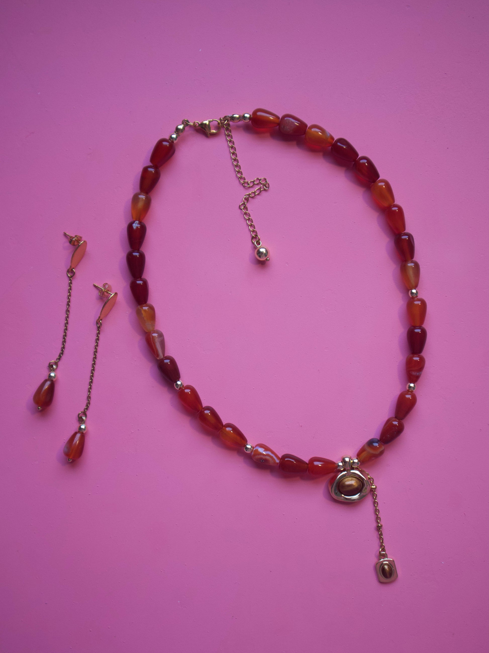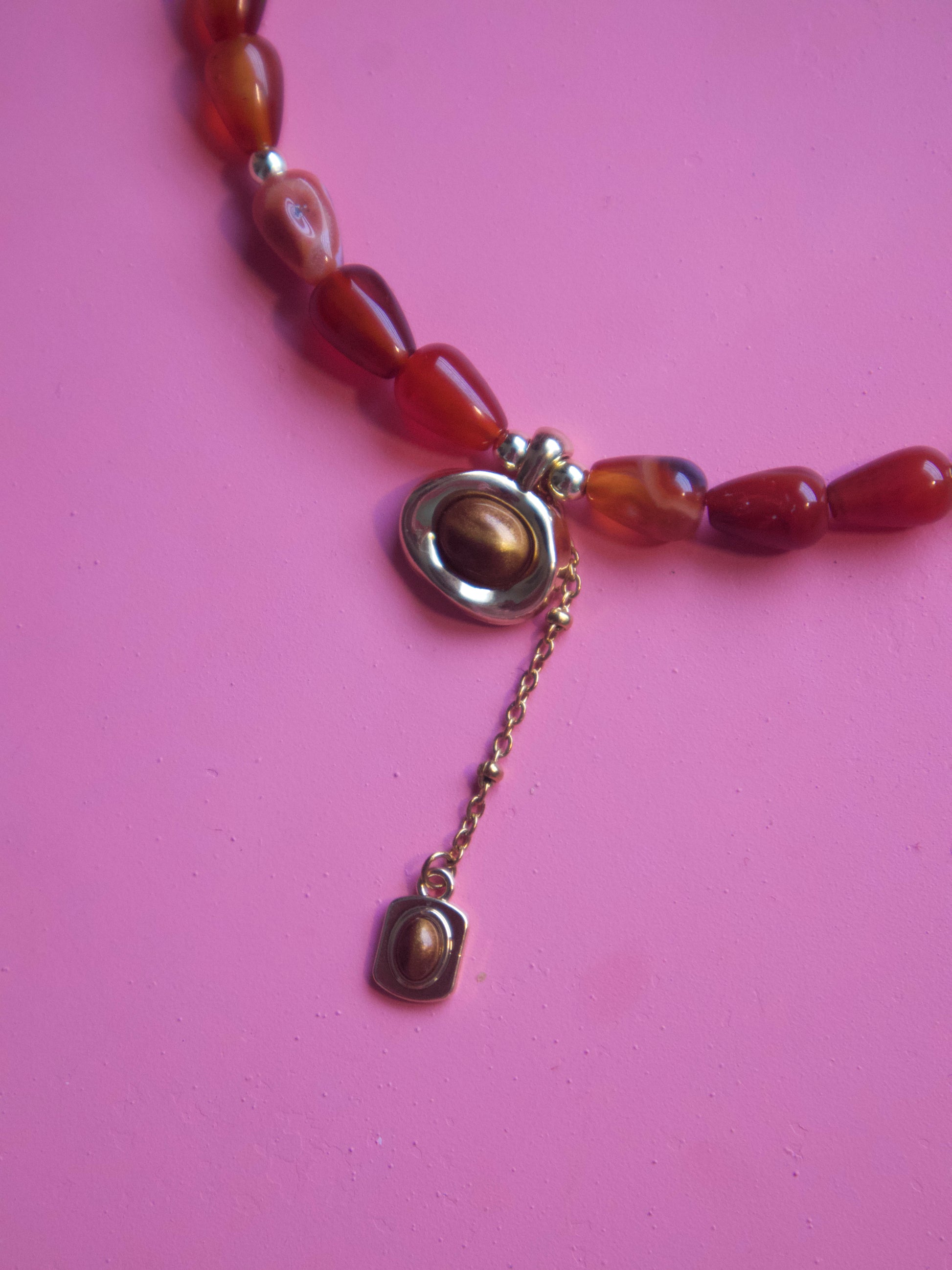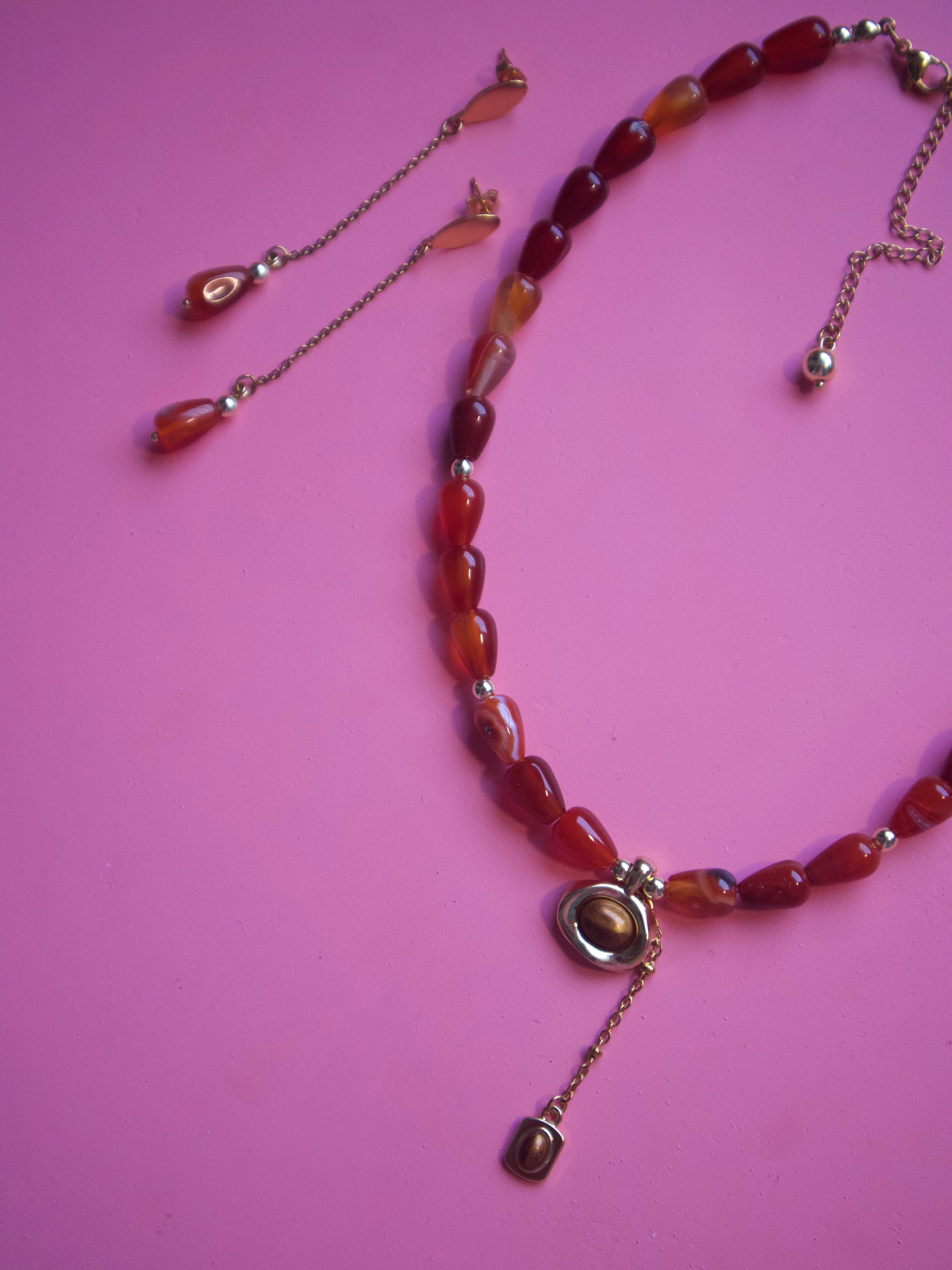 Collar con pantallas de piedras semipreciosas. Con charms bañados en oro. Medida de collar de 16” con 3” de extensión. Largo de pantallas 3” con Hoop en stainless steel.