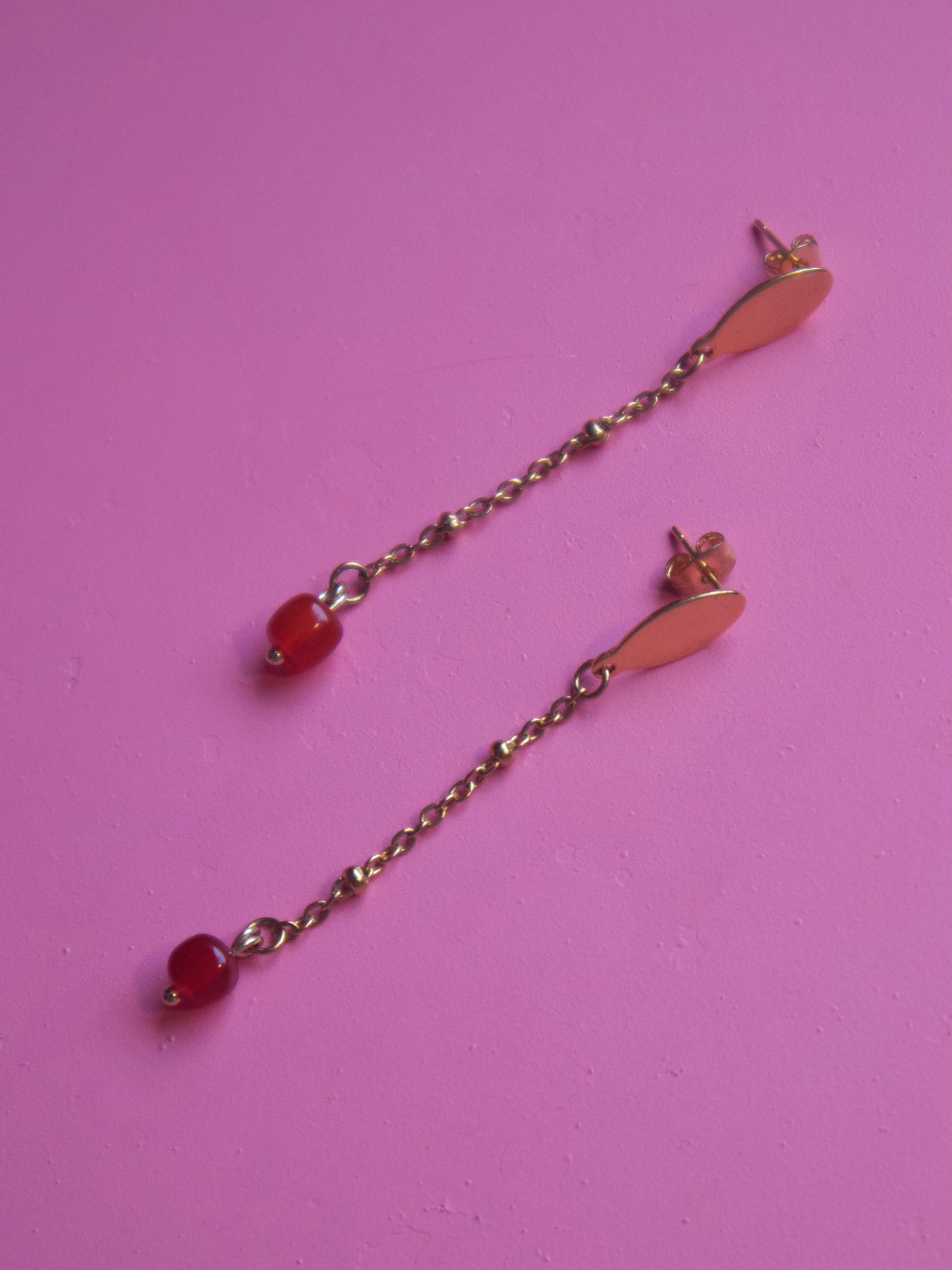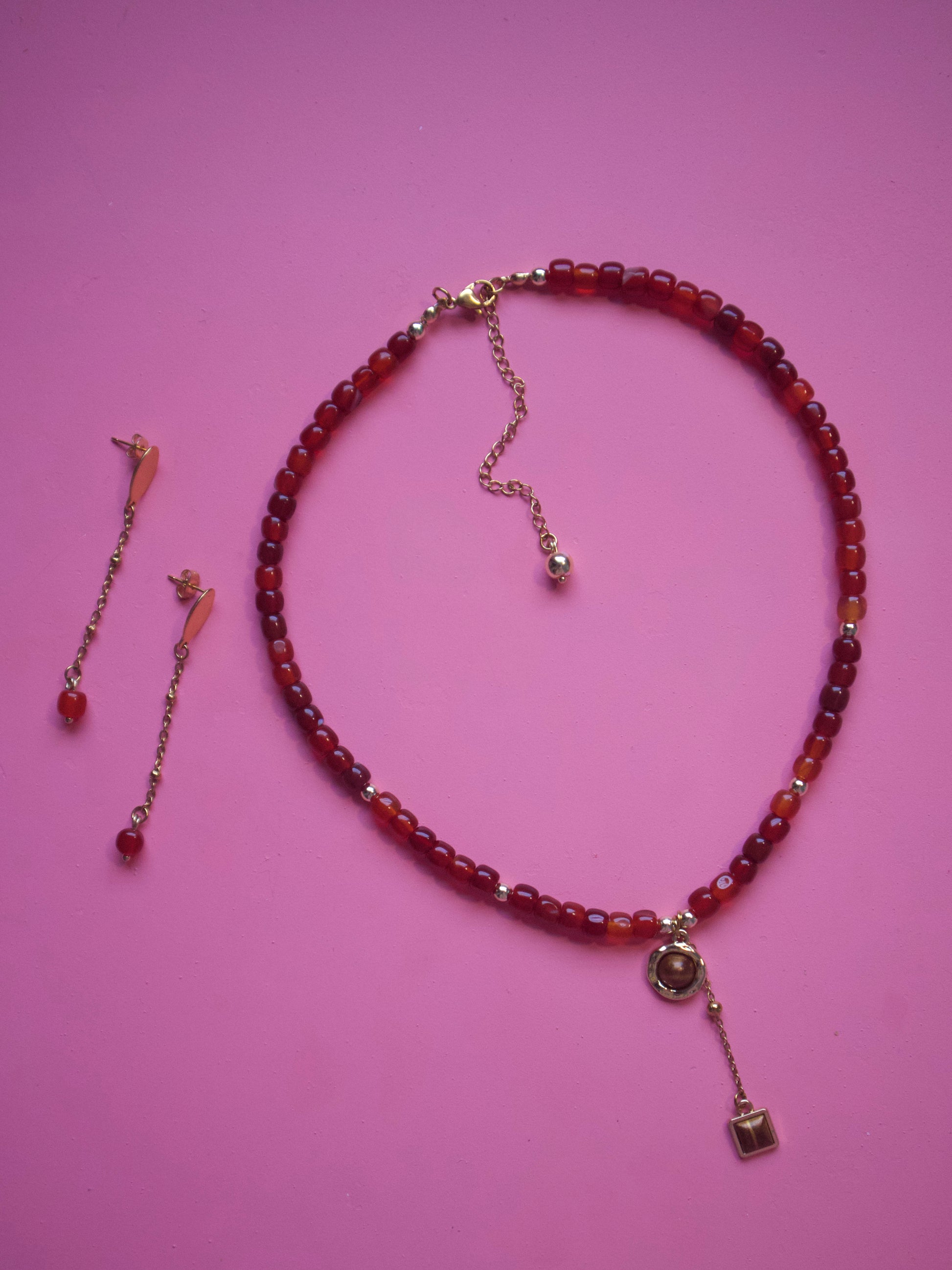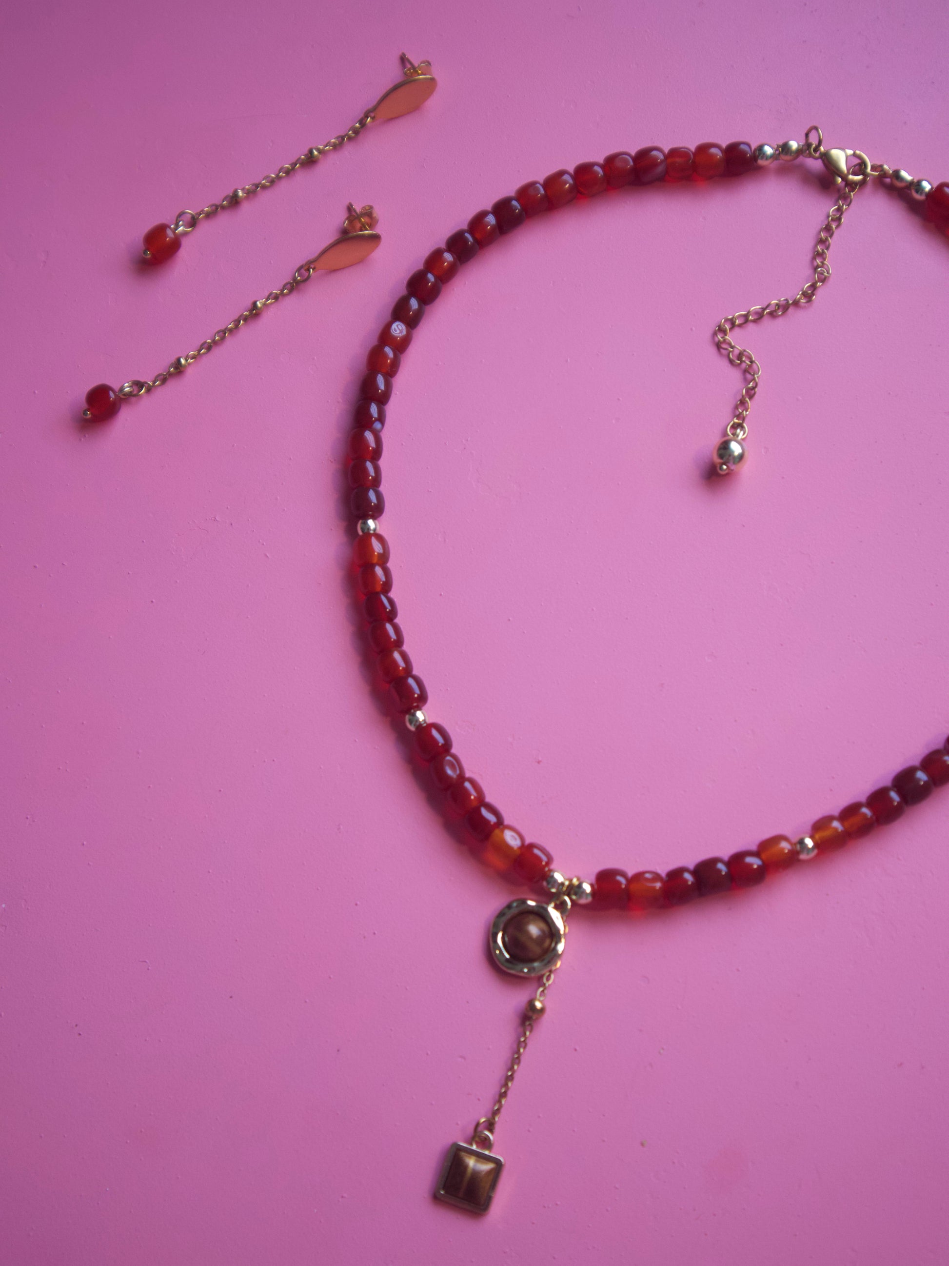 Collar con pantallas de piedras semipreciosas. Con charms bañados en oro. Medida de collar de 16” con 3” de extensión. Largo de pantallas 2” con Hoop en stainless steel.