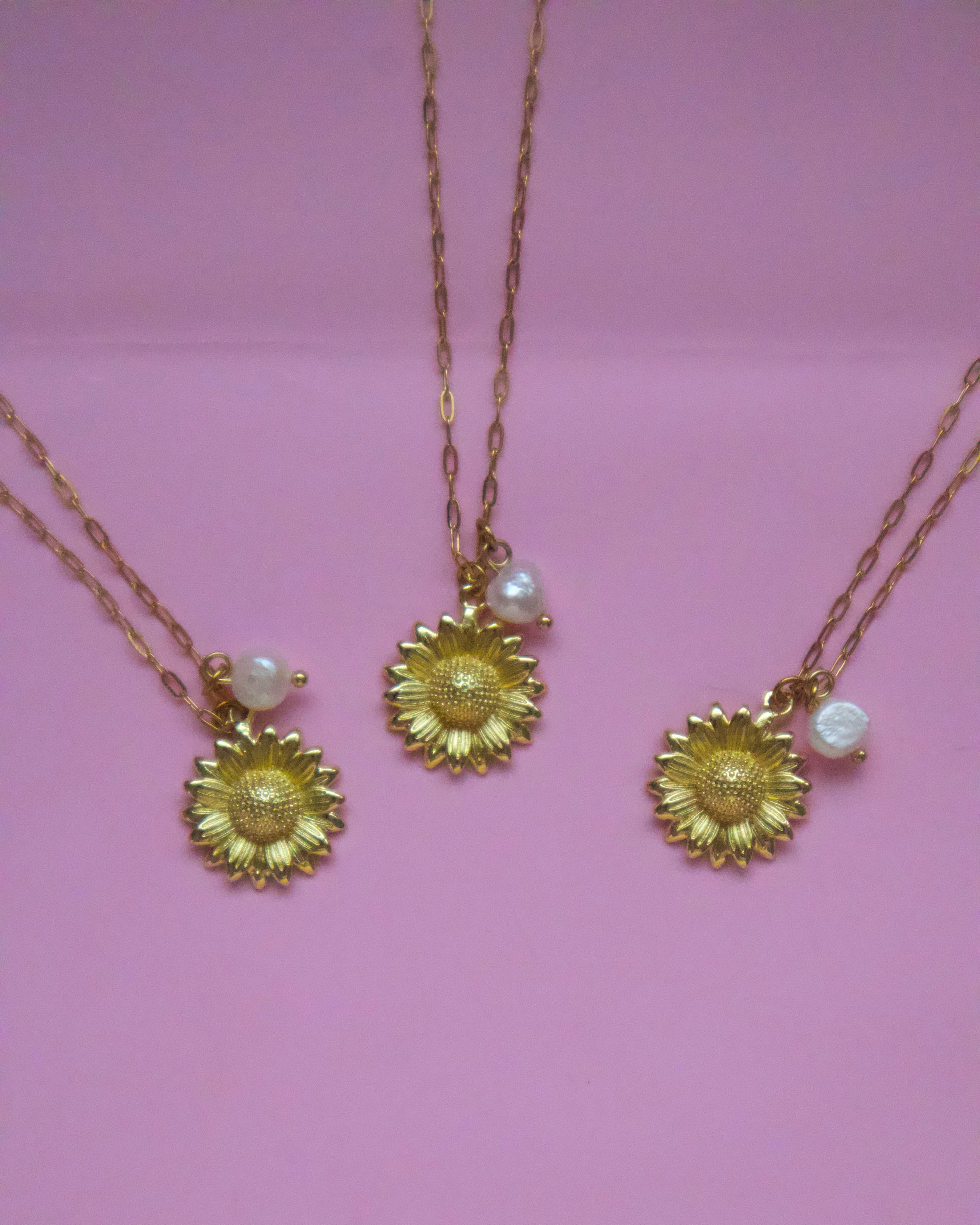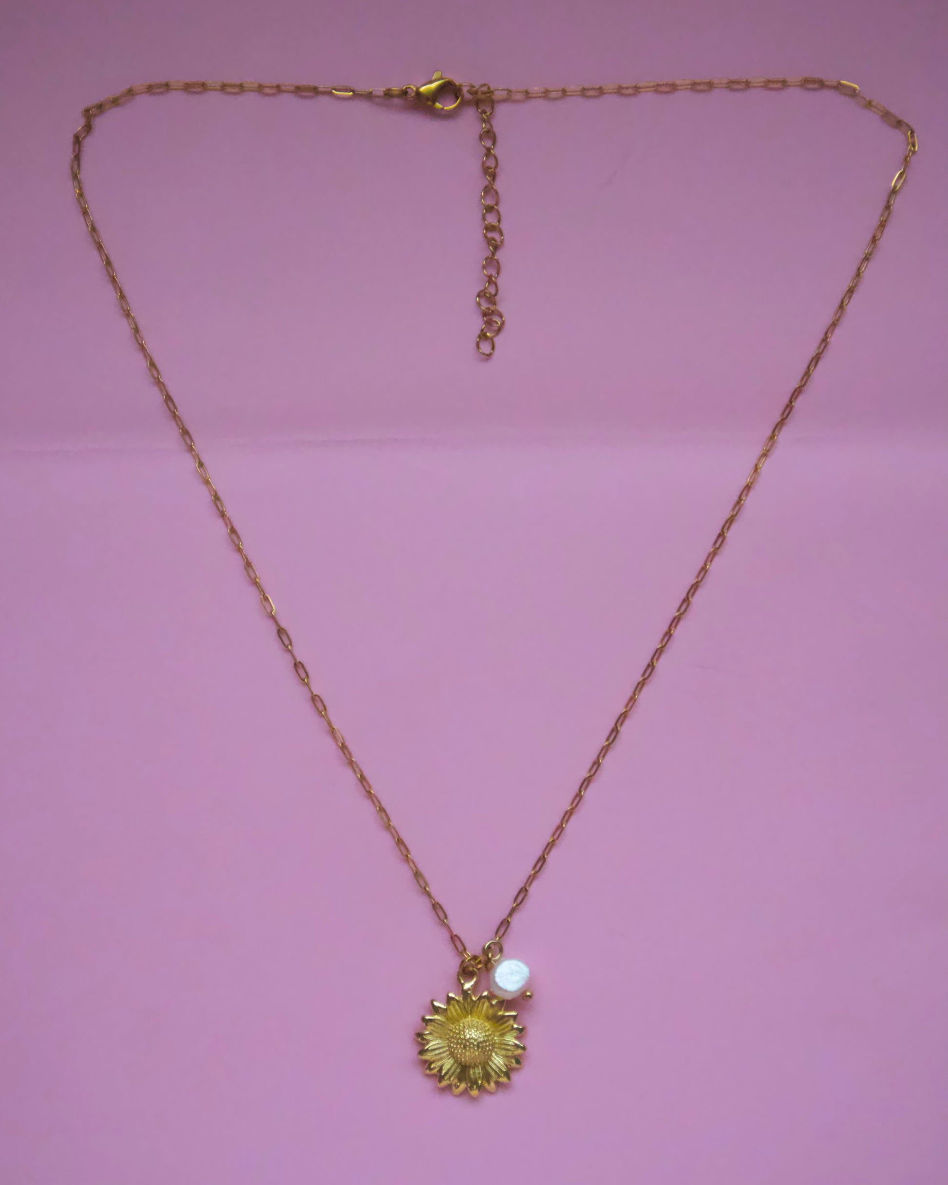 Cadena en stainless steel con charm de girasol bañado en oro con perla e agua dulce. Medida de 17” con 2” de extensión.