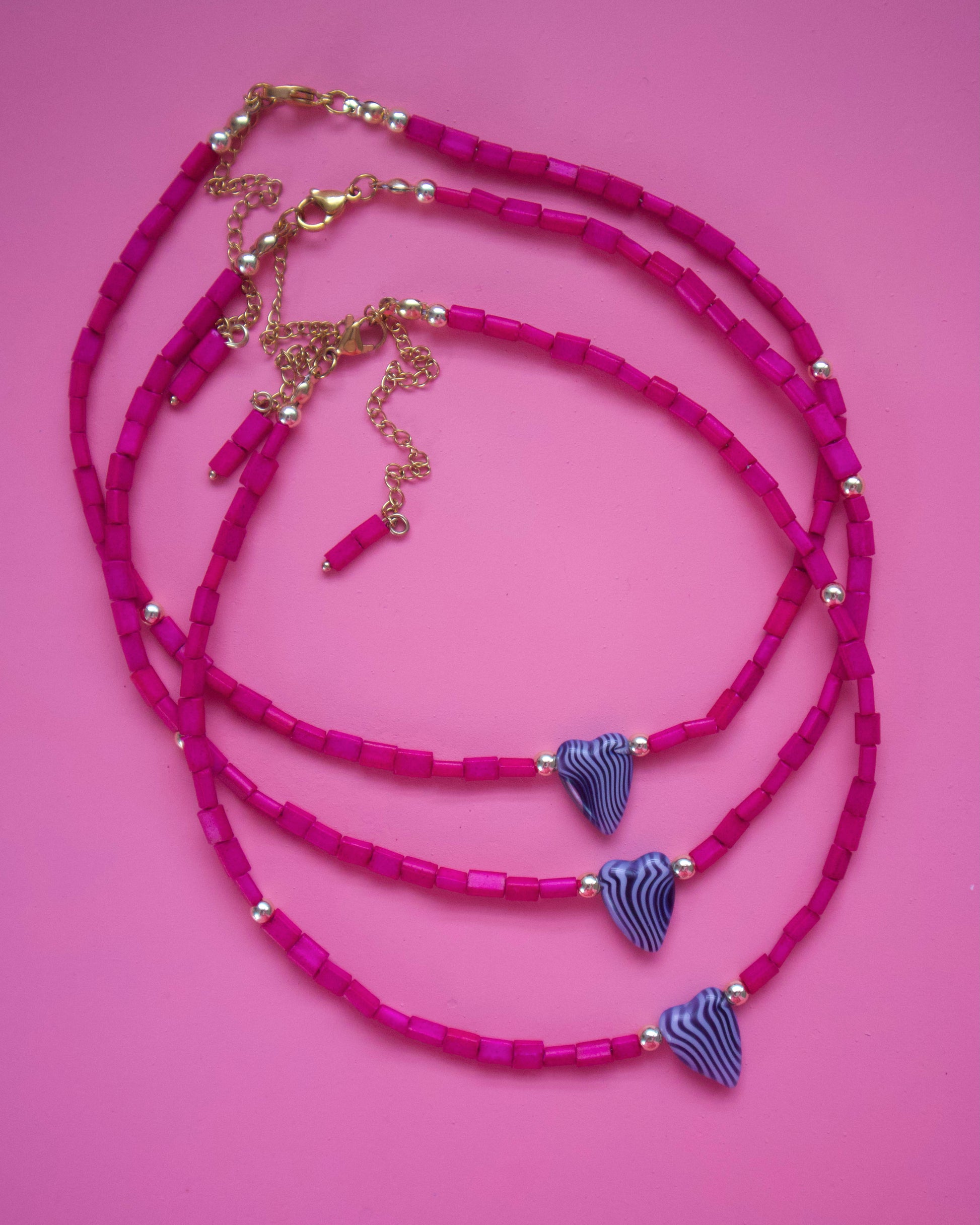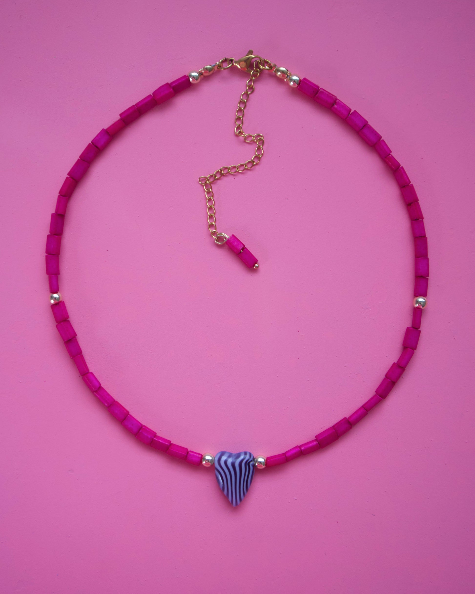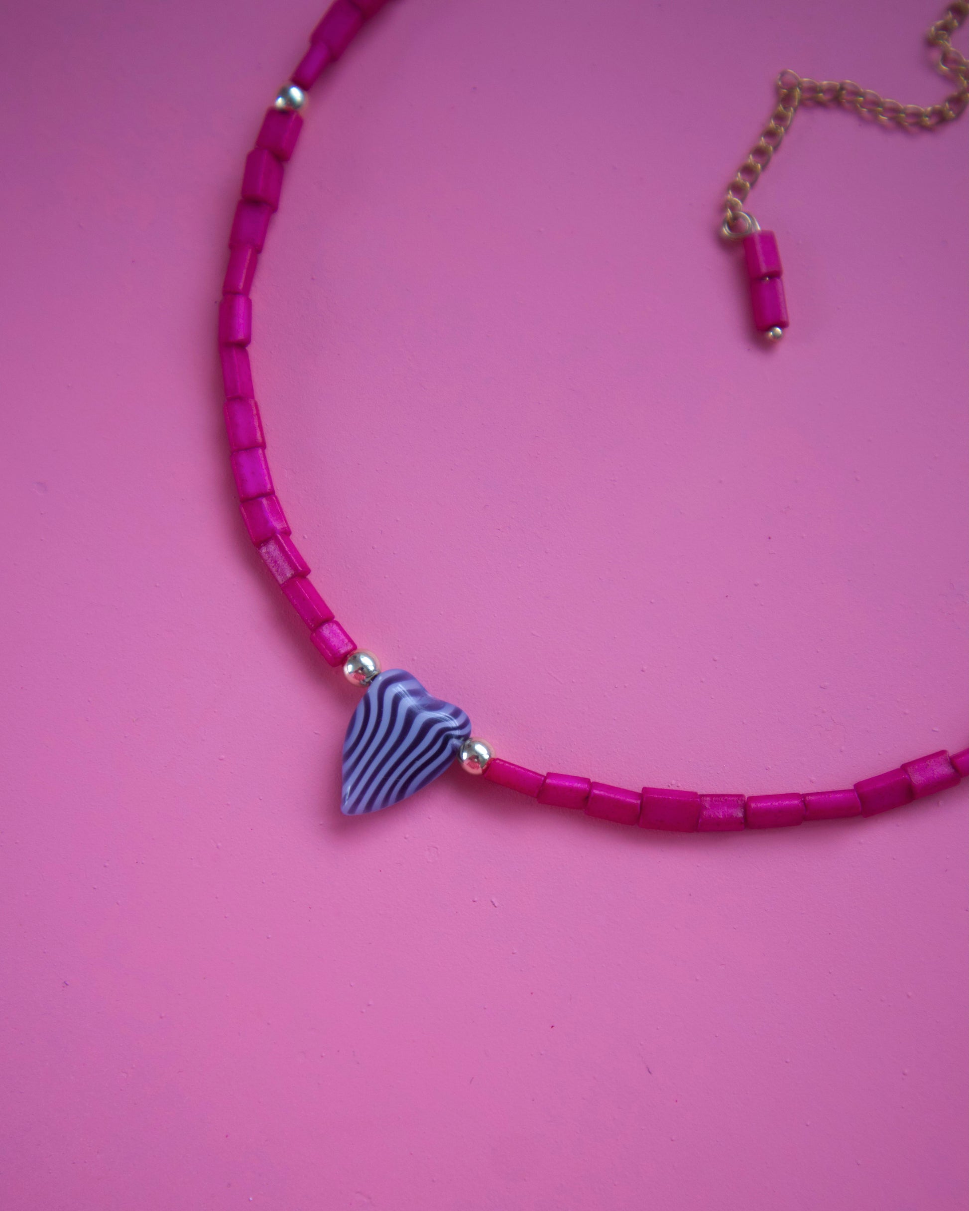 Choker de beads rosa, beads bañados en oro y charm de corazón con print de zebra. Medida de 14” con 3” de extensión.